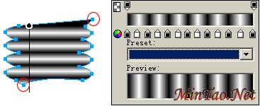 2.再复制3个,依次整齐排列,最好使用Alignment面板。然后使用“Modify/Combine/Union”命令,使他们成为一个整体,调整上下两端的节点,再用线性渐变(Linear)填充,具体设置如图。你也可以使用其他你习惯的方法做出相同的效果。