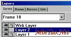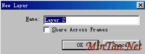 第四步:降落伞的第一阶段。本例的设计思想是,飞机刚要飞出画面以前,有一副降落伞从飞机上降下,降落伞的下降过程分为三个阶段:未张开时快速掉下,未张开到迅速张开,张开以后缓慢摇摆下降。本步骤为它的第一阶段。点击Frame面板左边的Layer(层),打开Layer面板,你会看到已经有了Web Layer和Layer1两个层,而Layer1(第一层)上放的就是我们前面做的飞机动画。点击Layer面板右上角的小三角形,选择New Layer(建立新层),弹出一个对话框,如图。