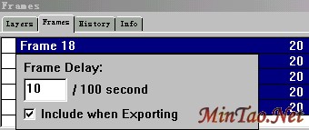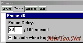 选择Window > Frames,打开帧面板,出现了一个有22行的帧编辑框,按着Shift键把他们全部选中,点击帧面板右上角的小三角形,选择Properties,在出现的对话框中把20改为10,使每一帧的播放时间由0.2秒变为0.1秒,再勾上下面的小方框。在帧面板的任意位置点一下鼠标,飞机的动画就完成了。按下屏幕右下角的播放键看一看,你会看到飞机由远处飞来,飞得越近就显得越大,最后从画面的左上方飞出。