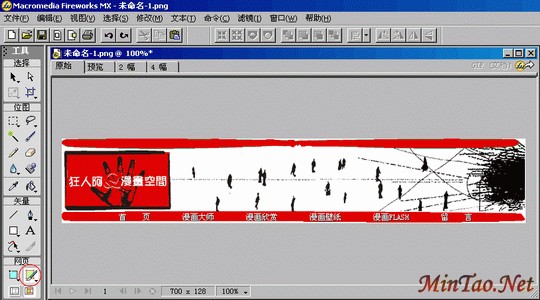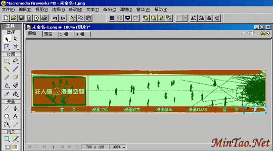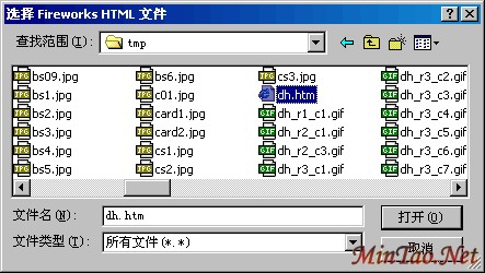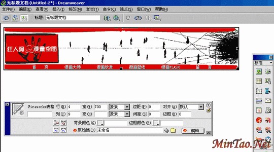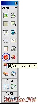 OK,至此我们已经完成在FW中的工作。打开DW,新建一文件,在“对象面板”中选择“插入 Fireworks HTML”按钮: