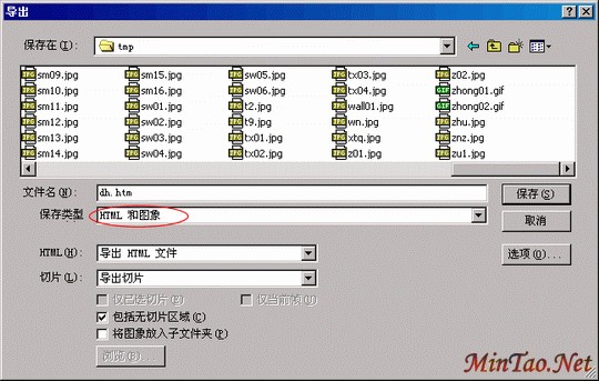 将各切片优化后,选择"文件——导出",在导出对话框中,为文件取名,并请注意导也类型为“HTML和图象”,如图。