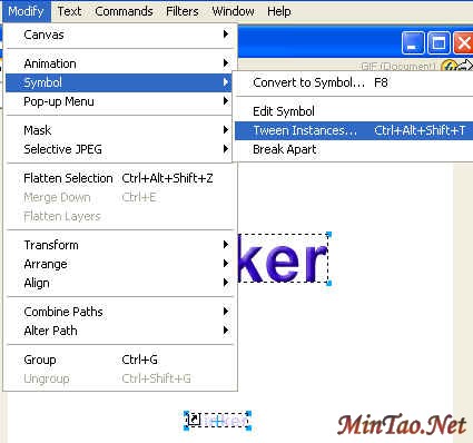 10、选取菜单Modify>Symbol>Tween Instances,在弹出的Tween Instances对话框中填上插入的中间渐变过程实例的数目。记住不要选中Distribute to frames,设置完毕,点击OK按钮。