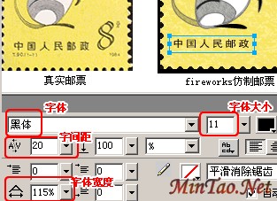 1、选中工具箱中的文字工具,输入“中国人民邮政”。在属性面板中调整字间距、字体等参数。字体设定为黑体、大小为11号,字间距宽度为20,字体宽度为115%。现在看文字是不是和邮票原样中的文字相同了。文字的位置在工作界面中的371*379。