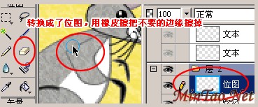 3、在形成的图形有一点需要特别说明,例如画老鼠的手,和身体相接的部分没有边缘,在肚子前面和手掌相接的部分有边缘的。这是如何做的呢?先画好手形状,然后选中它,按下键盘Ctrl+Shift+Alt+Z键,将矢量图转换成位图,可以在层面板中看到转换结果。现在用橡皮擦工具把不需要的边缘擦掉。