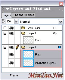 在帧面板中选择最后一帧,将其播放时间设置为0,点击左下角的播放按钮,预览动画效果,如果不太流畅,就返回上一步继续调整,如果流畅就删除Symbol中的标志。这时的图层面板如图: