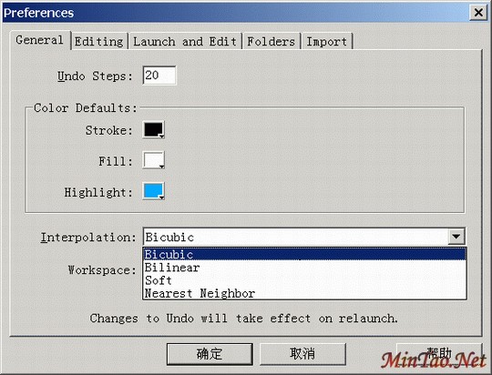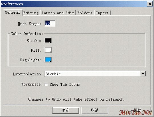 1)在Undo Step(撤消次数)后的文本框中可以设置编辑时记录操作步骤的次数,将撤消 / 重做次数设置为 0 到 999 之间的某个数。此设置对"编辑">"撤消"命令和"历史记录"面板都适用。大量的撤消会增加 fireworks 所需的内存量。为使此设置中的更改生效,必须重新启动 fireworks。