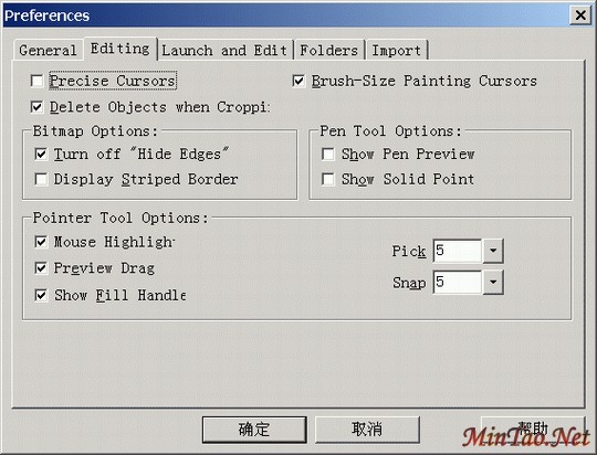 编辑参数选择控制指针的外观和用于处理位图对象的可视化提示。