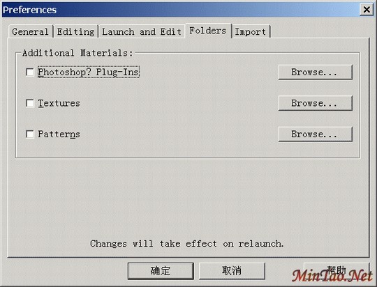 文件夹参数选择为您提供了对来自外部源的其它 Photoshop 插件、纹理文件和图案文件的访问。另外,在 Mac OS 9.x 上,您还可以指定希望 Fireworks 在哪里储存临时缓存文件。