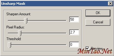 Sharpen amount: 50. Pixel Radius 2.7 到3.00。 Threshold: 0.
