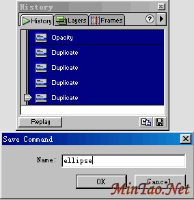 5、打开History(历史)面板,按住Shift键选择全部记录。然后按下面板右下角的“磁盘”标记,保存记录为命令。并在弹出的对话框中为这个命令命名。