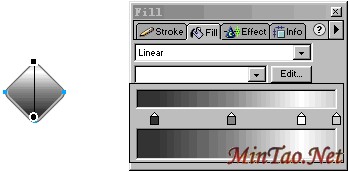 3、拷贝一份添加了效果后的图形,删除效果,在Info(信息)面板中将它的宽高各减少4像素。然后打开Fill(填充)面板,选择Linear(直线)类型为图形副本填充渐变。