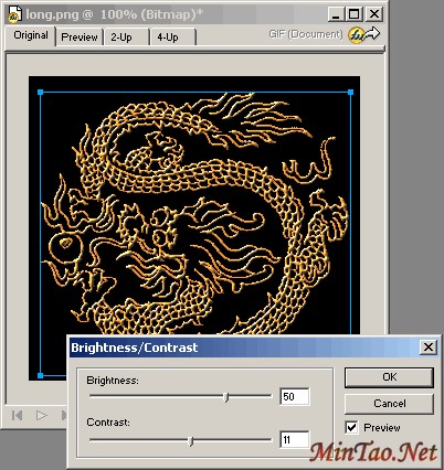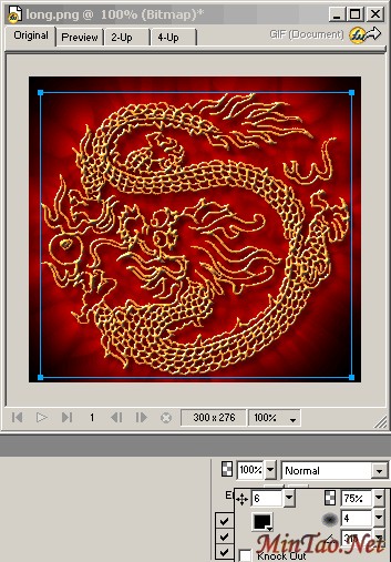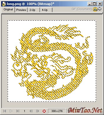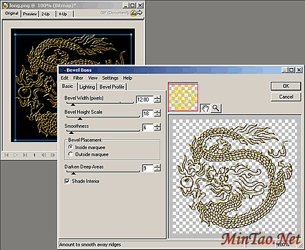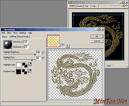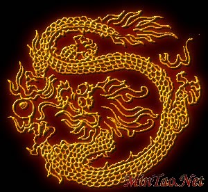 还可以加上这样一个步骤:在龙的图形还没做斜角时,先复制此层,备用。待全部操作完成后,把复制的这层放在最上面,然后模糊几次,改变透明度。这样一可以造成黄澄澄的感觉,二可以把斜角滤镜造成的尖锐部分柔化。