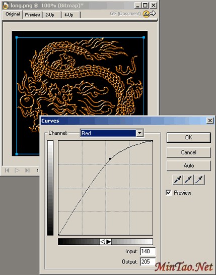金的颜色苍白了点,使用Properties属性面版下Effects:效果面版中Adjust Color-->Curves,调用色彩曲线调整功能,切换到红色Red通道,调整一下它的曲线。现在金龙已经有点样子了。