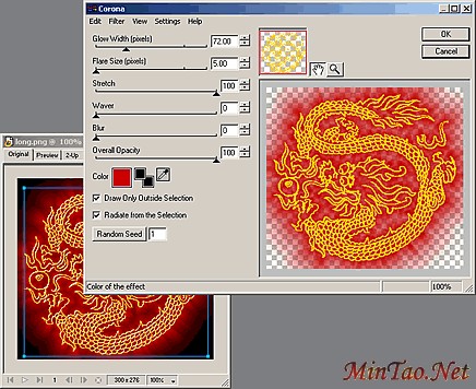 此后的工作就是增强金龙的整体环境效果了。先给他加点气势。既然已经在用Eye Candy 4000滤镜了,我们就让他再帮个忙。这次用的是Corona光环滤镜,设置见图。颜色我是在Define Custom Colors内自选的,Red198 / Green0 / Blue0。