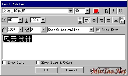 第四步:输入文字。这一步的关键在于文字字体的选择上,为了体现古印章的效果,我们最好采用一些古体繁体字,比如本例所采用的“文鼎古印体繁”,或者采用“汉鼎繁印篆”等等,这样效果会更逼真些。其余各项设定如图所示。