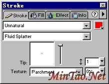第九步:选中任意一个字符对象,将其Fill(填充)选项设为None,同时将它的Stroke(描边)选项进行相关设定,描边类型选择“Unatural”具体形状选择“Fluid Splatter”,Tip形状采用默认的不做更改,描边宽度为1像素,不要材质填充,具体设定如图所示。