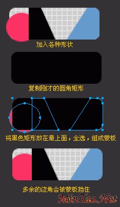 (4)下面的部分:画一个圆角长矩形,选择倾斜工具,点中矩形的底部角上的点,向内拉,形成梯形。