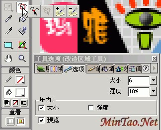 这时再选择工具栏中的“改造区域工具”,如图在其选项栏中调节压力点的大小,强度;再用这个工具在“玛”字的路径边缘向外拓展,文字就会变形(可以自己修改成各种形状,其他的文字变化之作道理同样)
