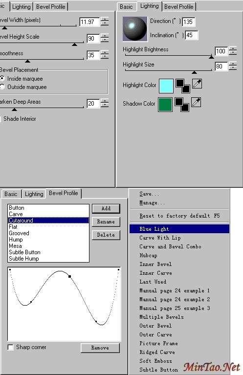(4)、最后这一项和上一节中的解释一样,它是滤镜内置的一些斜角效果,我想这多半是为了懒人准备的。我对它毫无兴趣。不过令我觉得可爱的一点是,这个菜单中有Save(保存)这一项,当然,当我们进行下去,你会发现其他很多滤镜中都含有这个命令。它是用来保存我们所做的效果的。当你费了很多的时间调节出来一个漂亮的效果,你一定很想保留它,以便下次继续使用,那么就使用它吧,它回很忠实的将你所做的效果保存在我们所看到的这个菜单中。你要做的就是,取一个你喜欢的名字,记住它。