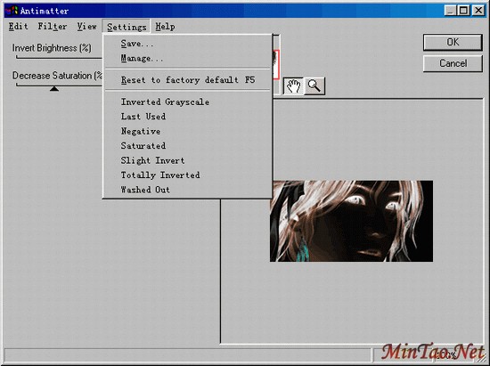 1、首先来了解这个集成滤镜的第一个命令“Antimatter(反向)”效果。这个命令主要针对图片使用,其作用与层面板中的混合模式相同,可将单纯的颜色模式变换出多种不同的样式。