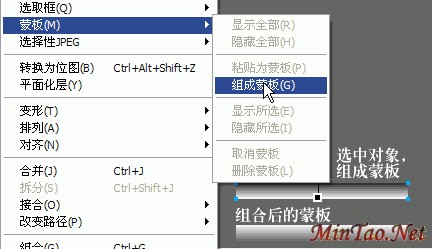 步骤四、将刚才作的两个矩形重叠,(白色的在下方,线性填充的在上方)然后选中这两个矩形,选择菜单-->修改-->蒙板-->组成蒙板。如图: