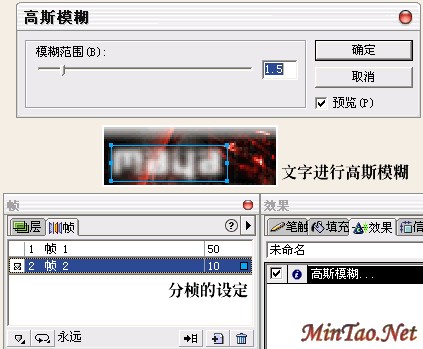 第二桢插入文字,并将文字效果定义为高斯模糊,模糊度为1.5,(桢延时=10)如图: