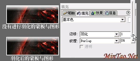 步骤五、把刚才做好的蒙板移到图案矩形的上部,修改蒙板的填充边缘为羽化度1,使其与图形的结合不至于太生硬。这样就形成了一种有光泽度的感觉。如图: