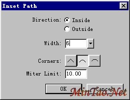 6、选定克隆对象,执行菜单命令“Modify--Alert Path--Inset Path”,在弹出的对话框中进行设定:注意Direction(方向)为Inside(向内);Width的数值不要设置的太大,这里采用了6像素大小,其余设定请参看下图: