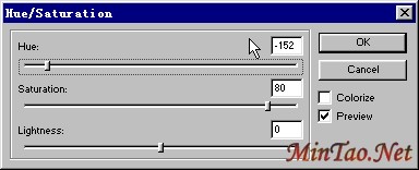 8、选定组合对象,打开Effect(效果)面板,执行其中的“Effect--Adjust Color--Hue/Saturation(色调/色相饱和度)”效果命令,在弹出的Hue/Saturation设置的对话框中进行设定,你可以自行调节进行设定,这里采用的各项数值的大小如下图所示:
