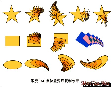 3、 旋转变形符号功能:在执行旋转变形前,现将对象转变为符号,然后执行旋转变形命令,执行完后通过改变符号中对象的中心点位置可以创造如下效果。