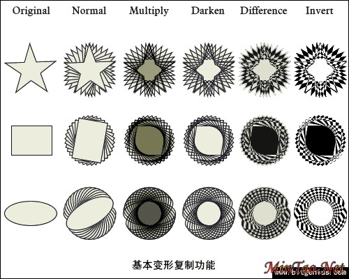 2、 旋转变形复制功能,同时改变旋转角度及放缩比例,并结合不同的混合模式,可以创造如下图所示的效果: