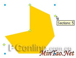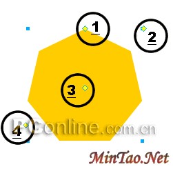 a、从工具箱选择该工具,在编辑区单击鼠标即可出现一个正多边形,默认情况下时出现一个正7边形。可以看到图形对象上有4个调节控制点,请看下方处理的标示图片: