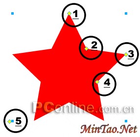 a、从工具箱选择该工具,在编辑区单击鼠标即可出现一个五角星,可以看到图形对象上有5个调节控制点,请看下方处理的标示图片: