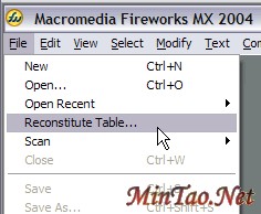 如果你有装满切片的整个HTML表格,但是你没有PNG源文件,表格重建命令将协助你解决问题。选择File-->Reconstitute Tables,指定任一包含图片切片表格的HTML文件,Fireworks会把它导入并整合成PNG文件。Macromedia定义的JavaScript行为命令,例如翻转图像和弹出菜单等,会一并导入并挂靠在相应的切片中。