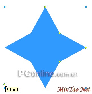 4、选中1号控制点,向下方拖动,本步操作的目的是为了减少星形对象的角的数量,只需要将5角星变成4角星即可了,如下图所示: