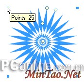 8、呵呵,是不是奇妙的图形效果已经展现在我们面前了?别急,接下来的操作产生的效果会更加让你目瞪口呆。还是选中1号调整控制点,这次我们向上方拖动鼠标,增加星形对象的角数,如下图操作演示: