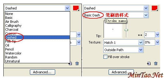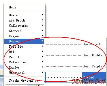 然后弹出笔刷设定对话框,选择笔刷的样式为虚线,再设定虚线笔刷的样式