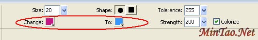 我们将这紫红色鲜花,部分花瓣的颜色替换成其他的色彩。使用替换色彩工具,然后在属性面板中设定工具的形状为圆形,大小为20,容差为255,压力为200。特别注意的是我们要设定将图片中的哪种颜色,替换成哪种颜色,这里将Change中准备替换的颜色设定为紫红色(用墨水笔在图片的花瓣上取色),在To替换后的颜色设定为浅蓝色。