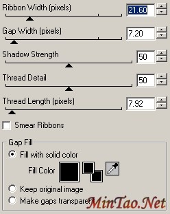 GAP FILL:共有三个选项,若勾选FILL WITH SOLID COLOR,则织条间隙为指定的色彩填充,若选择KEEP ORIGINAL IMAGE,则间隙被原始图象填充,若勾选MAKE GAPS TRANSPARENT,则间隙保持透明。本选项在BACKGROUND图层无效;