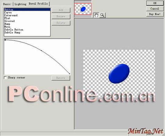 3、选中变形后的对象,执行Properties属性面板的Effects ---> Eye Candy 4000 LE ---> Bevel Boss 效果命令,在弹出的设置框中进行设定:Basic选项不用进行修改了,直接采用默认值即可;Lighting选项也采用默认值;Bevel Profile选项选择最上方的“Button”预设选项,点击确定即可,具体设定,请参看下图:
