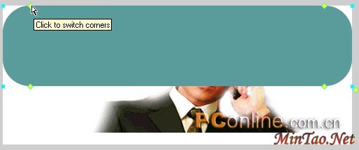 1、新建文件,文件大小随意,这里采用的是非正规的Banner尺寸:500*200像素大小。首先导入需要体现的位图图像,然后选取工具箱的Shapes工具组的园角矩形绘制工具,在编辑区绘制一个园角矩形,关于园角矩形的园角大小的调整,可以通过拖动位于四个角的黄色的菱形框来进行调整,如下图: