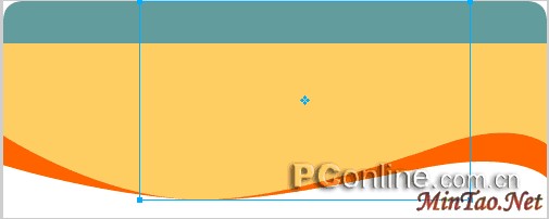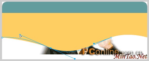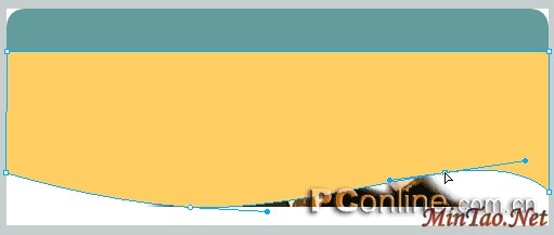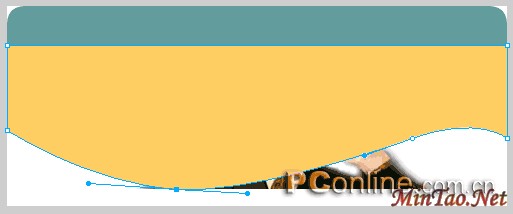 6、通过对两个路径节点的调节手柄的调节,拖动,可以使得原本水平的底面产生如下图所示的波浪形。其实我们通过使用钢笔工具使得两个路径节点的调节手柄显现出来后,剩下的调整工作就可以使用超级选择工具来进行了,这样比钢笔调整更轻松些,各位自行试验吧!