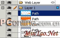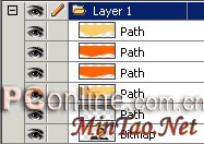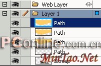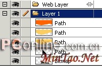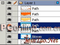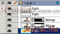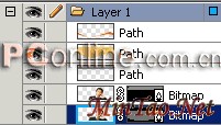 15、选定一个园角矩形对象,执行快捷键“Ctrl+X”,进行剪切操作,然后选定任意一个位图对象,执行菜单命令“Modify--Mask--Paste as Mask”(修改--遮罩--粘贴为遮罩);选定橙色路径对象,执行快捷键“Ctrl+X”,进行剪切操作,然后选定剩下的位图对象,仍然执行菜单命令“Modify--Mask--Paste as Mask”,此刻层面板的对象排列如下所示: