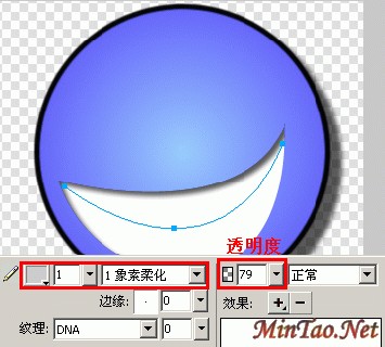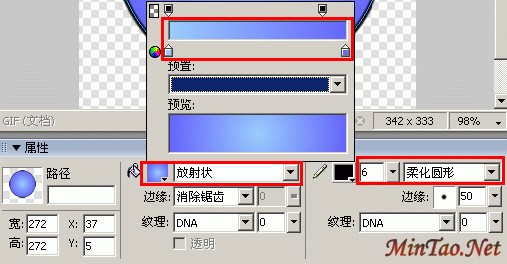 2.然后在工具栏里选择“椭圆选取框”工具,然后在“属性面板”中将填充类别设置为“放射状”,然后单击填充颜色框,将左边的色标颜色选择为“#99CCFF”,右边的色标颜色选择为“#6666FF”,描边颜色设置为黑色,描边种类设置为“柔化圆形”,然后再拖动描边大小滑杆,设置大小为6象素,按下Shift键,画出一个圆形,“属性面板”具体设置下图所示。