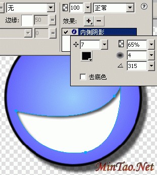 5.接下来给这个嘴巴加上“内侧阴影”效果,其效果设置距离为 7 ,透明度为65%、柔化为4、角度为315,颜色为黑色,经过这样的加工,就显出嘴巴的效果来了。