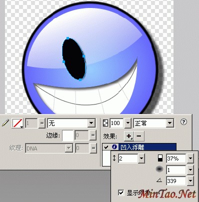 9.新建一层,然后选择“椭圆选区框”工具,“属性面板”中设置填充类别为“实心”,颜色为黑色,描边种类为无,然后画出娃娃左边的眼睛,然后设置效果为“凹入浮雕”,具设置数值如下图所示。