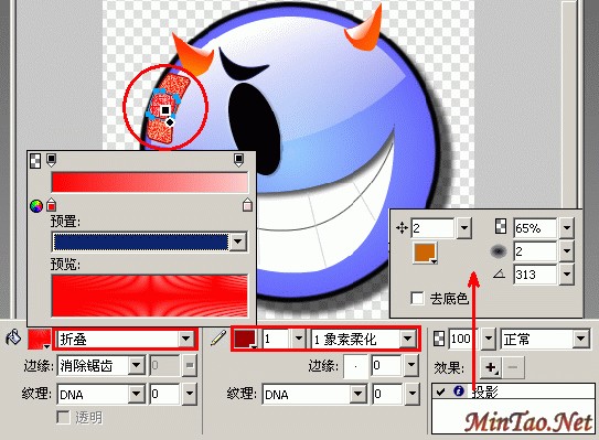 11.接下来我们给这个小魔鬼来个装饰品,给他带一个“创可贴”吧!嘻嘻(搞怪宝宝也经常搞的自己受点小伤)。新建一层分别用钢笔工具画出创可贴的两部分,其填充类别为“折叠”,其颜色设置中,左边色标颜色代码为 #FF0000 ,右边色标颜色为 #FFCCCC 。描边种类为“ 1 象素柔化”,绘制完后将这两部分选中组合,然后再添加投影效果,这个效果可以随个人喜好所定。