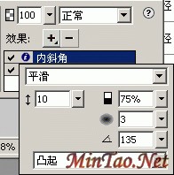 “内斜角”设置参数:斜角边缘形状为“平滑”、对比度为 75% 、柔化为 3 、角度为 135 、距离为 10 ,按钮预设为“凸起”。