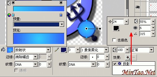 13.新建一层,选择“椭圆”工具,填充类别选择“放射状”、边缘为“消除锯齿”、描边种类为“1象素柔化”、笔尖大小为 3 。填充颜色框中左边色标颜色代码为 #CCFF00 ,右边颜色代码为 #669900 ,画出小魔鬼的右手,这只右手是用来握这只小铁钗的。接下来设置这个圆手的效果为“投影”,为小魔鬼的这只右手增加投影效果。其参数为:距离为 24 、透明度为 55% 、柔化为 6 、角度为 315 。