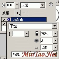内斜角参数:斜角边缘形状为“平面”、宽度为 4 、对比度为 75% 、角度为 135 、按钮预设为“凸起”。
